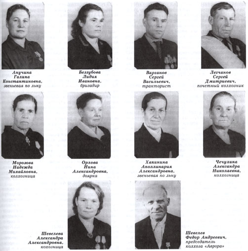 своих подчиненных: «Из года в год колхоз «Аврора» является передовым в районе. На войну ушло много людей. Приходится больше работать и больше контролировать работу других. Имеем по сравнению со среднерайонным показателем вдвое выше урожай зерновых. Все виды госпоставок, за исключением 19 из сена, выполнены. Мяса сдали вдвое больше, льносемени в 7 раз и льноволокна в 4 раза больше плана. План по поголовью крупного рогатого скота перевыполнен. К весеннему севу 1943 года семена проверены и очищены. Ниже 97 % всхожести нет. Патриоты нашего колхоза внесли на строительство танковой колонны 32 000 рублей из личных запасов в фонд Красной Армии. Собрано свыше 700 пудов зерна»[10].