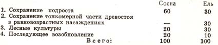 Для условий Вологодской области основные направления дальнейшего лесного хозяйства представляются в следующей принципиальной схеме. В части улучшения способов рубок и лесовосстановления необходимо прежде всего обеспечить сохранение предварительного возобновления, если оно жизнеспособно и соответствует условиям местопроизрастания. На остальной площади годичной лесосеки следует проводить лесные культуры за исключением определенного процента площади, где гарантировано успешное последующее возобновление ценных пород в короткие сроки. На основе обобщения научных работ и лесоустроительных данных восстановление хвойных пород представляется в следующем оптимальном соотношении от площади годичной лесосеки (в %):