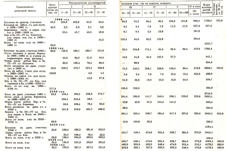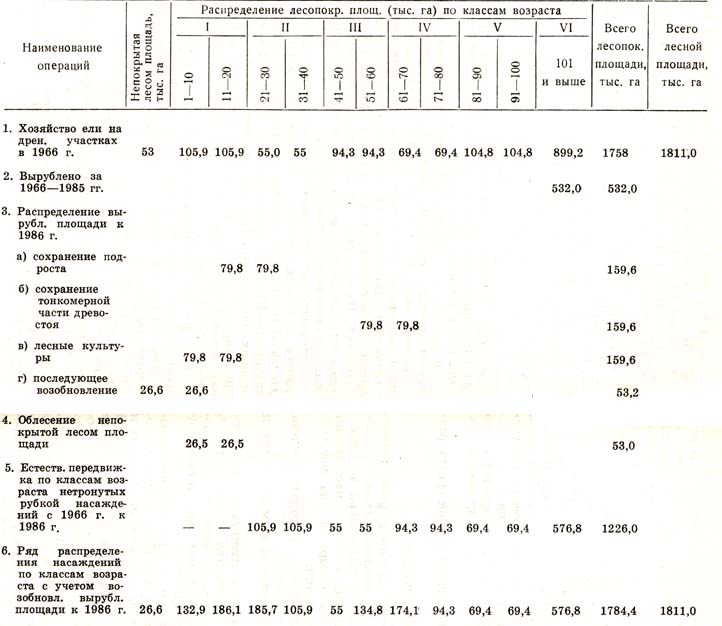 Вначале показывается распределение данного хозяйства по классам возраста за исходную дату учета (1966 г.). Затем определяются возможные резервы пополнения площади этого хозяйства за счет других хозяйств под влиянием намечаемых мероприятий. Например, на первый расчетный период (1966 – 1985 гг.) намечаются к осушке 237,5 тыс. га заболоченных ельников и 42 тыс. га низинных болот, примыкающих к осушаемым лесным массивам. Кроме того, планируется перевести в это же хозяйство за предстоящий период с помощью осушения и последующей реконструкции 161,6 тыс. га заболоченных березняков, а также 394,6 тыс. га. закультивированных вырубок из-под спелых березняков и осинников I – IV классов бонитета на дренированных участках. На 53 тыс. га непокрытой лесом площади будут созданы еловые культуры.