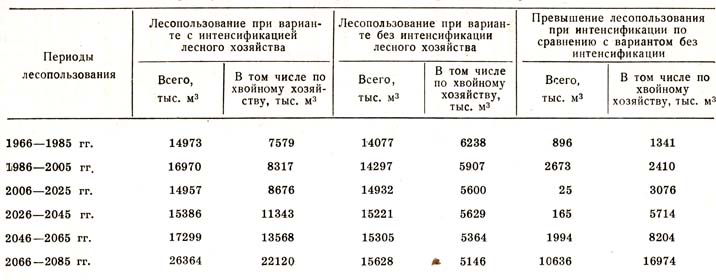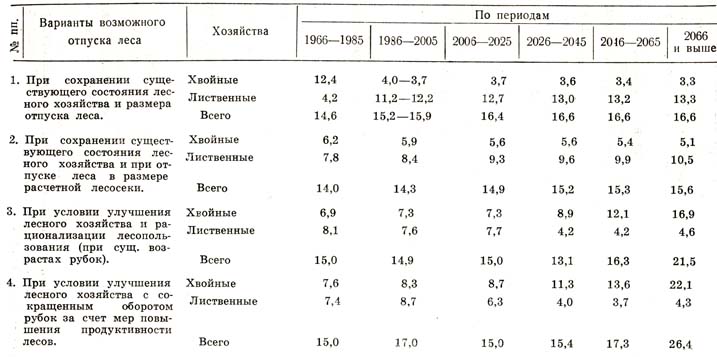 За счет дополнительных мер по лесовосстановлению, уходу и осушению лесов появляется возможность уже в первые три десятилетия увеличить возможный отпуск леса по хвойным породам в среднем на 1,4 млн. м3 при третьем варианте и на 2,4 млн. м3 при четвертом варианте по сравнению со вторым вариантом (при нынешней системе лесного хозяйства). Эта прибавка в первом случае составляет 20%, а во втором – 40%, что не так уж мало.