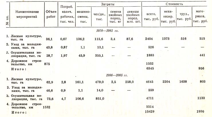 Ниже сделана попытка ориентировочно определить необходимые затраты труда и средств для осуществления намеченных мер при описанном выше варианте улучшения лесного хозяйства. Напомним, что наряду с существующими мероприятиями в него входят: осушительная мелиорация (по наметкам генсхемы), полный охват уходом нуждающихся в нем молодняков естественного и искусственного происхождения, проведения лесных культур не только на той части годичной лесосеки, которая требуется по каждому хозяйству, но и на площади лиственных насаждений, переводимых после рубки в хвойное хозяйство, а также на тех осушаемых категориях лесных земель, которые намечено держать под хвойными породами.