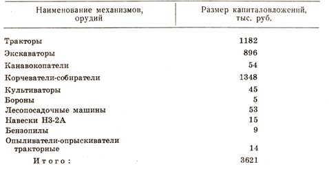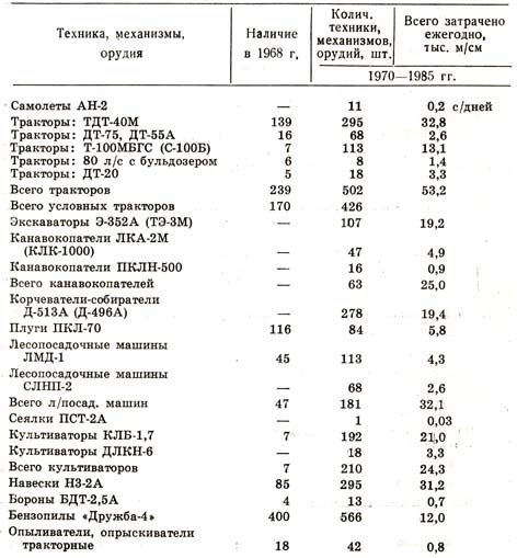 В табл. 83 приводятся данные необходимого количества техники, механизмов и орудий для выполнения намечаемых мероприятий. Учитывая современную оснащенность предприятий техникой, потребуется по каждому периоду увеличить общее количество: тракторов (в переводе на условные) – 2,5 – 5 раз в т. ч. мощных тракторов болотной модификации в 16 – 20 раз, лесопосадочных машин – в 4 – 7 раз, культиваторов в 27 раз, опрыскивателей в 2,5 раза и т. д.