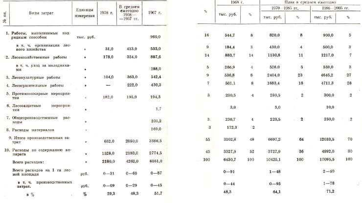 В табл. 85 показана динамика затрат на лесное хозяйство с 1958 по 1968 годы и на перспективу. Для сравнимости с существующими затратами на лесное хозяйство на оба перспективных периода рассчитаны все статьи расходов, включая расходы по содержанию аппарата, общепроизводственные расходы и т. д.