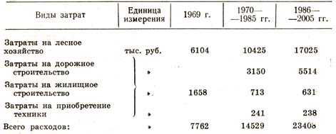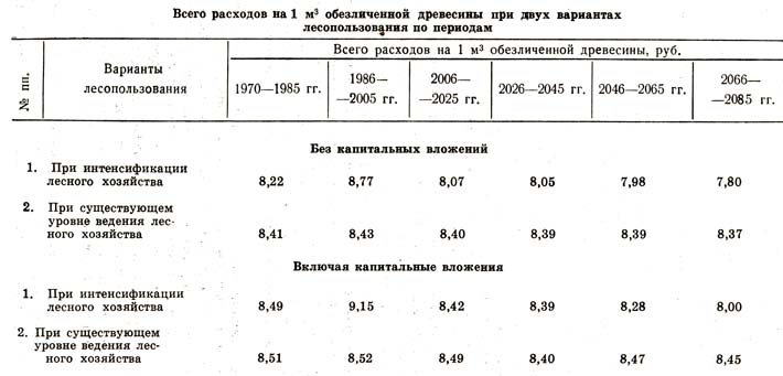 Для сравнения отметим, что в Литовской ССР уже сейчас производственные затраты составляют 3,64 руб. на 1 га, а в Эстонии – 8,54 руб. на 1 га. В таежных лесах Европейского Севера этот показатель является еще очень низким от 0,07 в Коми АССР до 0,55 в Кировской области (по данным 1965 года). Для условий Вологодской области увеличение показателя производственных затрат на 1 га лесной площади до 1,78 к 2000 году можно считать значительным, но не так уж высоким. Эти сравнения приведены, чтобы показать, что намеченный рост объемов работ отнюдь не является слишком высоким, а лежит в пределах темпов роста последнего десятилетия.