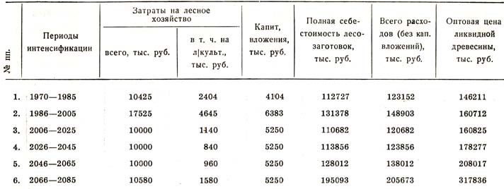 Затраты на лесное хозяйство, капиталовложения, полная себестоимость лесозаготовок и оптовая цена ликвидной древесины при интенсификации лесного хозяйства по периодам