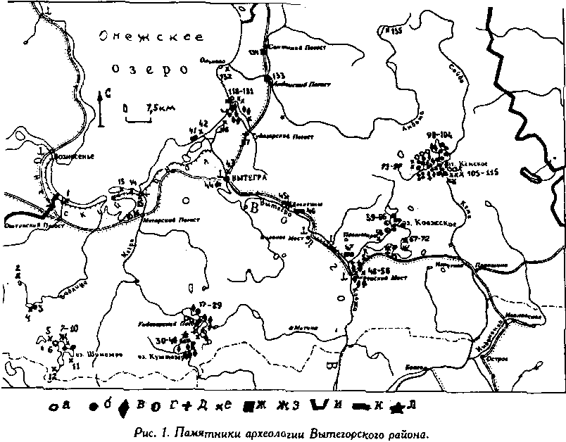 Цифрами на карте обозначены: 1 - Ошта: 2 - Торозеро; 3 - Павшозеро; 4 - Павшозеро-II; 5 - Шимозеро; 6 - Шимозеро-I; 7 - Шимозеро-II [Попов остров]; 8 - Шимозеро-III; 9 - Каменный наволок; 10 - Бесова близ Шимозера; 11 - Кангас; 12 - Верховье; 13 - Новый мыс; 14 - Долгое озеро; 15 - Усть-Мегра; 16 - Мегрское: 17 - Ундозерский Погост (неолит, ранний металл); 18 - Ундозеро-I (мезолит, неолит, средневековье); 19 - Ундозеро-II (мезолит, ранний металл); 20 - Ундозеро-III; 21 - Ундозеро-IV; 22 - Ундозеро-V; 23 - Ундозеро-VI; 24 - Ундозеро-VII; 25 - Ундозеро-VIII; 26 - Ундозеро-IX (мезолит, ранний металл); 27 - Ундозеро-Х; 28 - Мошники (селище XV-XVII вв.); 29 - Тюрбозеро {Протока] (ранний металл, средневековье); 30 - Куштозеро (XI-XII вв.): 31 - Куштозеро-I; 32 - Куштозеро-II (железный век, средневековье); 33 - Куштозеро-III (неолит, средневековье); 34 - Куштозеро -IV; 35 - Куштозеро-V; 36 - Куштозеро-VI; 37 - Куштозеро-VII; 30 - Куштозеро-VIII (неолит, средневековье); 39 - Куштозерский Погост (XIV-XVII вв.); 40 - Илекса (неолит, бронза); 41 - Южноонежское [Кюршевское]; 42 - Усть-Вытегра-I-IV; 43 - Вытегра; 44 - Вытегорский Погост [Анхимово] (XVI в.); 45 - Девятинское: 46 - Белоручейское: 47 - Александровское; 48 - Бадоги-I (XIV-XV вв.): 49 - Бадоги-11 (неолит, XIV-XV вв.); 50 - Бадоги-Ш (неолит. XIV-XV вв.); 51 - Бадоги-IV (XIV-XV вв.); 52 - Анненский Мост-I (неолит, железный век); 53 - Анненский Мост-П; 54 - Анненский Mocт-III; 55 - Ужла-I (неолит, средневековье); 56 - Ужла-П (неолит, средневековье); 57 - Ковжская плотина: 58 - Ковжское озеро; 59 - Григорьевское-I; 60 - Григорьевское-II; 61 - Кодамыс-1; 62 - Кодамыс-П; оЗ - Кужозеро-1; 64 - Ламбамыс-1; 65 - Ламбамыс-11 [Остров]; 66 - Грязезерка; 67 - Якшино-I (XIV-XVII вв.); 68 - Якшино-II: 69 - Якшино-III; 70 - Якшино-IV; 71 - Якшино-V [Кябелово]; 72 -Павшинское озеро; 73 - Кукозеро-1; 74 - Кукозеро-П (ранний металл, средневековье): 75 - Кукозеро-III; 76 - Кукозеро-IV; 77 - Кукозеро-V (ранний металл, средневековье); 78 - Кукозеро-VI; 79 - Кукозеро-VII; 80 - Кукозеро-VIII (неолит, железный век); 81 - Кукозеро-IХ: 82 - Кукозеро-Х; 03 - Кукозеро-ХI; 84 - Кукозеро-XII; 85 - Кукозеро-XIII; 86 - Кукозеро-XIV; 87 -Кукозеро-XV: 88 - Кукозеро-XVI; 89 - Кукозеро-XVII; 90 -Кукозеро-XVIII (неолит, ранний металл); 91 - Кукозеро-ХIХ; 92 - Кукозеро-ХХ; 93 - Кукозеро-XXI (неолит, ранний металл); 94 - Кукозеро-ХХП (неолит, ранний металл): 95 - Кукозеро-ХХШ: 96 - Кукозеро-XXIV: 97 - Кукозеро-XXV; 98 - Кемозеро-I: 99 - Кемозеро-П; 100 - Кемозеро-III; 101 - Кемозеро-IV (неолит, ранний металл): 102 - Кемозеро-V (неолит, ранний металл); 103 - Кемозеро-VI; 104 - Кемозеро-VII; 105 - Кемский Погост-I; 106 - Кемский Погост-П [Хутор] (неолит, ранний металл); 107 - Кемский Погост-III; 108 - Кемский Погост-IV; 109 - Кемский Погост-V; 110 - Кема-1: 111 - Кема-II; 112 - Кема-Ш; 113 - Кема-IV; 114 - Кема-V; 115 - Кема-VI; 116 - Лужандозеро; 117 - Тудозерский Погост; 118 - Тудозеро-1 (неолит, ранний металл); 119 - Тидозеро-II (неолит, ранний металл); 120 - Тудозеро-III; 121 - Тудозеро-IV; 122 - Тудозеро-V (мезолит, средневековье); 123 - Тудозеро-VI (III тыс. до н. э.); 124 - Тудозеро-VII (неолит, бронза); 125 - Тудозеро-VIII (неолит, ранний металл); 126 - Тидозеро-IХ; 127 - Устье Тудозерское [Протока]: 128 - Устье Тудозерское [Протока II]; 129 - Пустошь-I (мезолит, бронза): 130 - Пустошь-II: 131 - Пустошь-III [Исакова] (ранний металл, средневековье); 132 - Андома; 133 - Андомское; 134 - Саминское; 135 - Купецкий Погост.