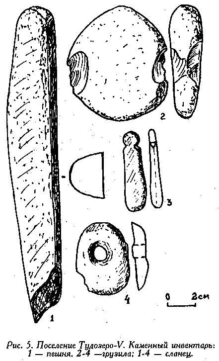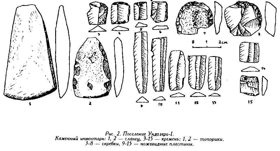 Еще раз хочется отметить, что своеобразный ландшафт района, недостаток удобных для поселения мест, меняющийся гидрологический режим рек и озер создали ситуацию, когда одни и те же места использовались населением разных эпох. В результате большинство открытых археологических памятников содержит два-три культурных слоя. Так, поселение Ундозеро-I было заселено в мезолите, и жизнь на нем с перерывами продолжалась до середины I тысячелетия до н. э. На поселении Тудозеро-V - с мезолита до XII века н. э., а отдельные находки на поселении относятся и к более позднему времени. Памятники с культурным слоем, относящимся к какой-либо одной эпохе, редки.