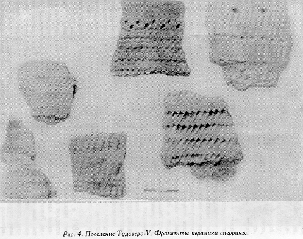 Для нижнего слоя получены радиоуглеродные даты 7240+60 (ТА-2354), 6250+50 (ГИН-8050), 6110+100 (ГИН-7662), 6230+120 (ГИН-7663) лет назад, что, по нашему мнению, вполне согласовывается с набором инвентаря, в котором преобладают сланцевые и кремневые орудия мезолитического облика. Керамика представлена чистым комплексом культуры сперрингс, входящей в круг ранненеолитических культур с гребенчатой и накольчатой орнаментацией. Слой может быть датирован временем не позднее конца VI - начала V тысячелетия до н. а. Таким образом, керамика нижнего слоя поселения Тудозеро-V - наиболее ранняя в ареале распространения памятников культуры сперрингс и самая древняя на территории Вологодской области.