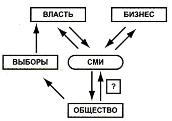Отметим, что при советской власти треугольника «власть – бизнес – общество» на вершинах и СМИ в середине, не существовало, конструкция представляла собой вертикаль, во главе с коммунистической партией, затем власть, отождествленная с бизнесом, далее – СМИ, и, наконец, общество.