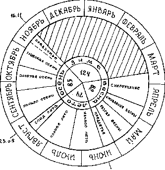 Что же такое календарь природы? Как его составляют? Известно, что сроки наступления календарных и фенологических (естественных) времен года не совпадают, что зависит от климатических особенностей местности. Обычно за ряд лет по всем имеющимся наблюдениям рассчитывают среднюю дату наступления того или иного явления и располагают все полученные даты в хронологическом порядке по сезонам года. Продолжительность фенологических времен года можно изобразить на круговой диаграмме (рис. 2). Следует отметить, что для более полной характеристики местного биоклимата год делят не только на сезоны, к названиям которых все мы привыкли, но и на подсезоны. Предложено множество вариантов периодизации года, но для нашей территории чаще всего используется схема естественной (фенологической) периодизации года, предложенная ведущим фенологом профессором Г. Э. Шульцем (1).