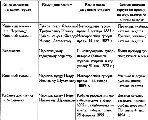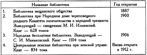 Судя по этим данным, к услугам читающей публики в провинциальном Череповце имелось шесть библиотек. Для города с населением в 14 тысяч человек это совсем неплохо.