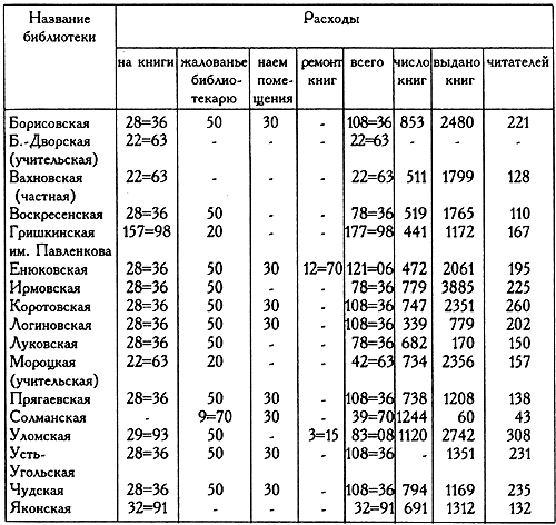 К этому времени в Череповецком уезде действовало уже 16 библиотек-читален, из которых половина была открыта на земские средства, а другая половина — на средства сельских обществ.