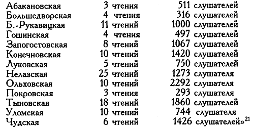 На всех чтениях было 9088 слушателей, а при присоединении сюда певчих, входивших без билетов, получится 10 418 слушателей, что составит по 548 слушателей на каждое чтение средним числом.