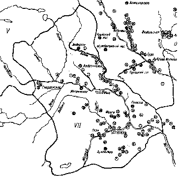 VII - Устюжно-Железопольский уезд: 1 - Липовцы, 2 - Сергеем, 3 - Березовыми, 4 -Колодно, 5 - Кононова, 6 - Литовец,, 7 - Погорелка, 8 - Мартыном, 9 - Игнашево, 10 -Клопчшно, 11 - Прохода, 12 - Нестерова, 13 - Понизье, 14 - Бобынино, 15 - Селище, 16 -Ушакова, 17 - Иевково, IS - Загршье, 19 - Селиверстова, 20 - Петряево, 21 - Заборовье, 22 - Кузьминская, 23 - Железное Поле, 24 - Пачино, 25 - Циково, 26 - Лукьянова, 27 -Кочубино, 28 - Черенское, 29 - Гришнево, 30 - Погорелка, 31 - Мережа, 32 - Лентьево, 33 -Шуклию, 34 - Зуево (Орел), 35 - Ванек, 36 - Оснополье, 37 - Ельники, 38 - Деревяга, 39 -Долоцк, 40 - Леонтьево, 41 - Соловцово, 42 - Плотичье, 43 - Шолоцкая, 44 - Оглино, 45 -Никольская, 46 - Давыдова, 47 - Избыщное, 48 - Остров, 49 - Федоровское, 50 - Софрон-цево, 51 - Логинова, 52 - Чирей,, 53 - Максимовская, 54 - Новинка, 55 - Олейники, 56 -Федотовская, 57 - Селище, 58 - Кортиха, 59 - Соболева, 60 - Алексеиха, 61 - Липецка, 62 -Александрова, 63 - Осиновик, 64 - Шилова, 65 - Захарьевская, 66 - Степачево, 67 -Дягилева, 68 - Волосово, 69 - Соловцово, 70 - Доманово, 71 - Лукьянцево, 72 - Сенцово, 73 -Селище. Источник: Сербина К.Н. Крестьянская железоделательная промышленность Северо-Западной России XVI - первой половины XIX вв. Л., 1971. Карта 1.