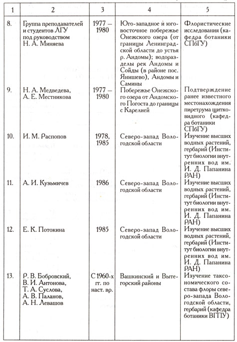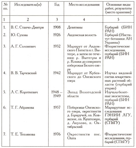 В первой половине XX столетия ботанические исследования на территории района носили фрагментарный характер. В этот период территория современного Вытегорского района не входила в состав Вологодской губернии, поэтому она не была охвачена интенсивными флористическими исследованиями ботаников - краеведов И. А. Перфильева, А. А. Сняткова, Г. И. Ширяева и др. В послевоенные годы Вытегорский район неоднократно привлекал внимание исследователей (табл. 1), но до настоящего времени флора района в целом все еще недостаточно изучена, особенно по сравнению с близлежащими регионами — Республикой Карелия и Ленинградской областью.