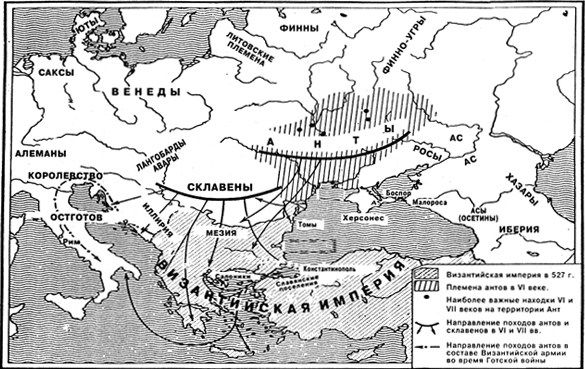 бия, родина антов. Сначала анты оказали яростное сопротивление, но затем вступили в переговоры с захватчиками. Согласно Менандру,[16] имя посла антов было Мезамер. Он был сыном Идарисия и братом Келагаста. Первое из этих имен, вероятно, славянское (Безмер), два других звучат как иранские или тюркские.[17] На всем протяжении переговоров поведение Мезамера было надменным и независимым. Исходя из этого мы можем предположить, что анты не считали себя побежденными. При таком положении дел в игру вступил хан кутригуров. Если наше предположение верно (в том, что он до этого просил антов о помощи, но получил отказ), то оно объяснит его враждебное отношение к ним в данной ситуации. Он добился своего, убедив Байана, что Мезамер - опасный противник, особенно с тех пор, как он стал обладать большим авторитетом у своего народа, и лучшее, что можно сделать, - это избавиться от него, а затем перейти в решительное наступление. Байану понравился такой совет, и он приказал предать Мезамера смерти в нарушение кардинального принципа международного права, несмотря на то, что оно было общепризнанным.[18]