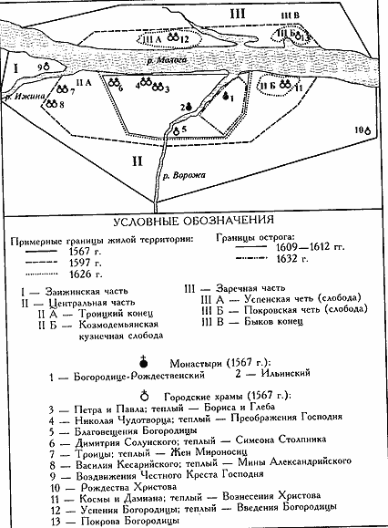 В середине XVI века Устюжна Железопольская занимала всю нынешнюю территорию по обоим берегам Мологи. Более того, часть городских дворов располагалась в районе Городища и вверх от него, по Мологе и Ижине. Реки Молога, Ижина и Ворожа делили город естественным образом на несколько частей: Заижинская сторона, Центральная (правобережная) и Заречная (левобережная) части (см. рис. 1).
