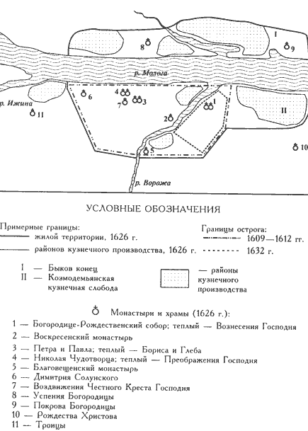 Основной, центральной, частью города была территория по правому берегу Мологи, вниз от устья Ижины. Река Ворожа, небольшая по ширине, делила эту территорию на две части. Она не представляла серьезного естественного препятствия для развития городской инфраструктуры. В нескольких местах ее берега соединяли мосты и плотины, а позднее, в первой четверти XVII века, и стены острога. Река Ворожа не была тем объектом, который делил город на отдельные районы, и для писцов, описывавших посад в XVI-XVII веках. Эти обстоятельства позволяют при сравнительном анализе демографических процессов и развития городской территории, социальной дифференциации или профессионально-территориальной структуры городского населения считать указанную территорию единым целым.