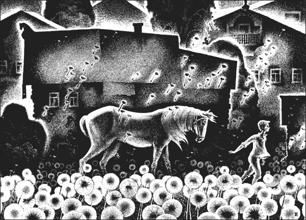 62. Одуванчики. Из серии «Вологодская деревня». 1977. Бумага, тушь, перо. 40x59.