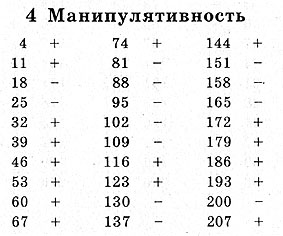 Четвертая шкала измеряет черту личности, называемую "манипулятивность". Обладателей высоких баллов по этой шкале характеризует хладнокровие, расчетливость, хитрость, практичность (даже эгоцентричность), строгое следование исключительно своим интересам в отношениях с другими людьми. Низкие баллы получают те, кто по характеру дружелюбны и доверчивы, способны сопереживать другим, несколько прямолинейны и даже альтруистичны; такой человек не лишен наивности, поэтому его легко обмануть.