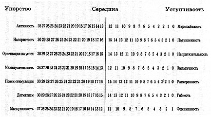 полученные баллы по семи шкалам надо внести в приведенную ниже профильную таблицу, с помощью которой вы сможете узнать, каков ваш характер - "мягкий" или "жесткий". Если обнаружится, что ваши баллы располагаются большей частью выше центральной линии, значит, вы упорны, склонны к жесткости; если же баллы оказались в основном ниже этой линии, то ваш характер можно определить как уступчивый, мягкий. Можно было бы предложить читателям отдельные профильные таблицы для мужчин и женщин (поскольку мужчины характеристически более "упорны", чем женщины), однако мы посчитали, что вам будет интереснее самим интерпретировать свои результаты, сравнив их с баллами ваших друзей или с усредненными показателями.