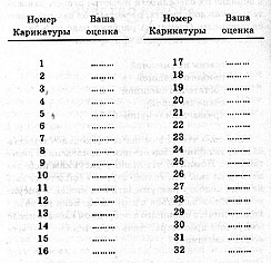 Для того чтобы вам легче было подсчитывать баллы, запишите свои оценки в приведенной ниже таблице. Помните, что оценку рисункам надо давать сразу же, как только шутка "дойдет" до вас; не надо подолгу раздумывать над каждым рисунком или возвращаться к ним снова. Если вы не находите ничего смешного в очередном сюжете после минутного просмотра, ставьте ему оценку 1 - "совсем не смешно".