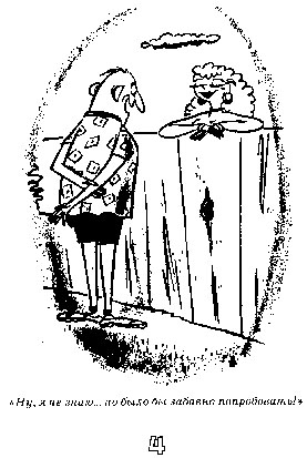 Содержание четвертого вида юмора очевидно и без подсказки: это рисунки на сексуальные|темы. Причем некоторые из сюжетов грубы и вульгарны настолько, насколько вообще позволяют требования к публикациям в книгах подобного жанра. К сожалению, данная шкала может эффективно дифференцировать людей только в том случае, если хотя бы часть из них будет задета, даже в какой-то степени оскорблена содержанием данных шуток. Рисунки 4, 8, 12, 16, 20, 24, 28 и 32 помогут вам определить свое отношение к шуткам на сексуальные темы и принесут баллы, соответствующие этому отношению.