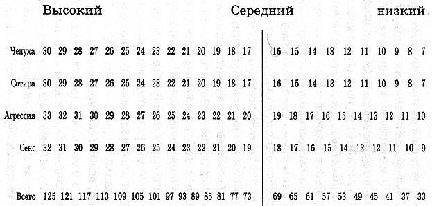 В данном тесте использовано четыре вида юмора. Первый из них называется "чепухой". Рисунки с "чепухой" не имеют агрессивного или сексуального содержания; в данном случае эффект зависит от их формальной техники - двойного значения слов или совмещения несоответствующих элементов. Восемь шуток, относящихся к этому виду юмора, это рисунки 1, 5, 9, 13,17, 21, 25 и 29. Вам нужно сложить оценки, которые вы дали этим восьми рисункам, получить некоторый суммарный балл он будет в интервале между 8 и 40), а затем отменить это значение на приведенном ниже профильном листе.