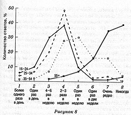 На рисунке 8 показано распределение ответов, которые были получены на репрезентативной британской выборке в процессе опроса, проведенного ведущей социологической службой Великобритании (Марплан). Совершенно очевидно, что даже внутри одной возрастной группы существуют огромные различия. Так, среди 20-летних некоторые занимаются сексом чаще одного раза в день, другие - только редко или вообще никогда. С возрастом частота половых актов уменьшается, но при этом сохраняется большое разнообразие индивидуальных вариантов. Средний показатель вообще скрывает индивидуальные различия, что справедливо не только для частоты половых актов, но и для субъективного отношения к половой жизни, поэтому средние показатели нам здесь не помогут. Все диаграммы, подобные той, что приведена выше, полез-