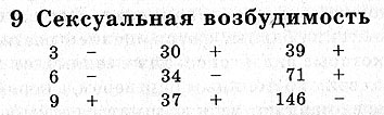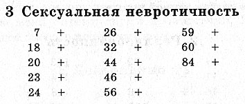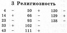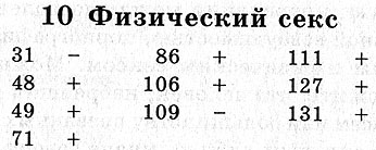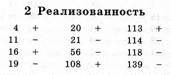 Ключ для данного опросника приведен ниже. Этот ключ, как и другие ключи данной главы, несколько более сложен, чем те, что использовались в предыдущих тестах. Так, если после номера вопроса стоит знак "плюс", то ответ "+ +" оценивается как 5 баллов, ответ "+" оценивается как 4 балла, ответ "0" приносит 3 балла; "- -" дает 2 балла и "-" соответственно 1 балл. Если же после номера вопроса стоит знак "минус", тогда вся эта 5-балльная шкала разворачивается в обратную сторону, а именно: ответ "- -" означает 5 баллов, "-" приносит 4 балла, 0 дает 3 балла, "+" оценивается в 2 балла и "+ +" соответственно в 1 балл.