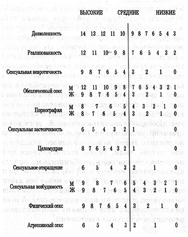 Данный опросник позволяет оценить ряд основных, или "контекстных" факторов, и первый такой фактор- "дозволенность". Набравшие высокие баллы одобряют сексуальную свободу, считают, что не надо препятствовать широкому распространению наркотиков или преследовать "странных" людей, таких, как хиппи или гомосексуалы. Их жизненная философия строится на легком отношении к текущим событиям, терпимости к другим людям и поиске удовольствий. Люди, набравшие низкие баллы по данной шкале, питают явное отвращение ко всем этим вещам и одобряют строгую цензуру, недопущение антиобщественного поведения, строгие наказания для нарушителей закона. Не удивительно, что этот фактор хорошо коррелирует с аналогичным фактором дозволенности, полученным на основе опросника сексуальных отношений (см. предыдущую главу).