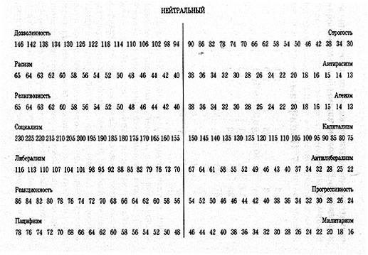 Иначе говоря, сначала суммируйте баллы, полученные по шкалам "реакционность", "расизм" и "религиозность", умножьте эту сумму на 2, а затем отнимите от полученной цифры сумму баллов по шкалам "дозволенность", "социализм" и "пацифизм". Если полученную вами цифру поместить на диаграмму, то положительные баллы окажутся на консервативном участке горизонтальной оси, а отрицательные - на радикальном участке той же оси.