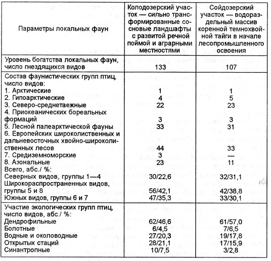 Сойдозерский темнохвойный участок. Всего зарегистрировано 124 вида птиц, из них 107 гнездящиеся. Снижение уровня богатства локальной фауны, по сравнению с предыдущим участком, обусловлено плакорным обликом ландшафта и преобладанием монотонной еловой тайги, слабым развитием или отсутствием интразональных элементов ландшафта – речных пойм, крупных водоемов, сельхозугодий и населенных пунктов. В этой связи обеднен видовой состав гидрофильных птиц, отсутствуют многие обитатели агроландшафта и виды синантропной фауны – в сумме только 39 видов, тогда как на колодозерском участке встречаются 65 видов указанных экологических групп (см. табл.). Обитание большинства птиц открытых стаций в условиях темнохвойного участка приурочено к граничащим с ним вырубкам и немногим фрагментам речных пойм или сельхозугодий, встречающимся, например, близ побережья оз. Сойдозеро. Отсутствие в глубине плакорной тайги многих азональных и южных птиц обуславливает и более выраженный северный колорит локальной фауны: 32 северных и 33 южных вида, тогда как в окрестностях Колодозера – соответственно 30 и 47 видов.