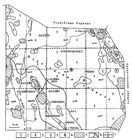 1 – сосна; 2 – ель; 3 –береза; 4 – осина; 5 – болота; 6 – линии водоразделов; 7 – квартальные просеки