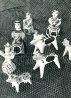 А потом оставил себе на память о поездке в Каргополь и Гринево несколько игрушек — свистульку-Сирин, кадриль, женщину с ребенком, охотника и лося, а остальные передал часть в Исторический музей, часть в Музей народного искусства, а часть подарил ценителям народного искусства — у нас такая керамика стала сейчас самой популярной. Наверное потому, что она лишена показной пышности, искренна и простодушна.
