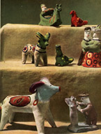 Показывает она и игрушки. Они поменьше дружининских — сантиметров восьми-девяти. Из-за нехватки красок раскраска довольно простая — кирпично-красным, черным и вяло-зеленым тонами. Но работает она даже при скудных красочных возможностях не без выдумки. Так, у белой утушки красная головка, а глаза и перышки намечены черным. У белого медведя на лапах красные валенки и вокруг туловища двухцветный красно-черный пояс. У белого барана — красные рожки, на боках орнамент: круги с крестами внутри, гребенки черточек, гнезда точек, зигзаги.