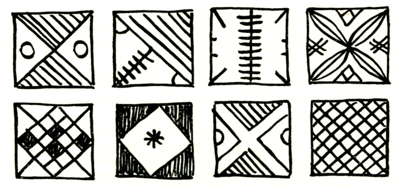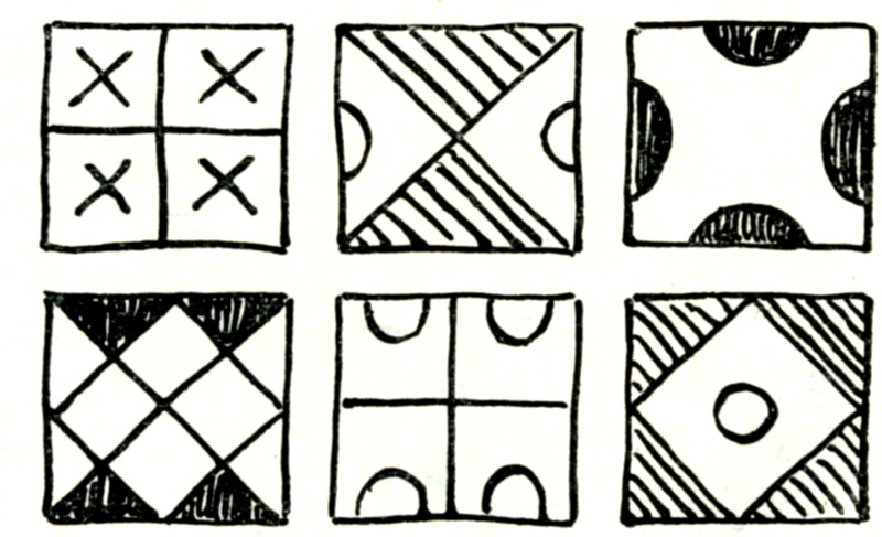 Это либо диагональные крестики в разделенном на четыре части квадрате, либо квадрат, расчерченный диагонально на четыре маленьких квадратика и восемь треугольников, либо диагонально или прямо деленный квадрат с круглыми скобками, либо светлый квадрат в темном, где в центре в свою очередь кружок.