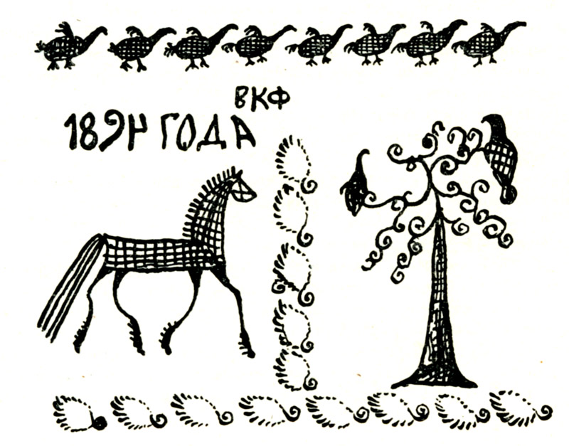 Казалось бы, не так уж и трудно придумать подобные узоры, но, судя по всему, заимствовать «чужое» в Палащелье считалось недопустимым, и каждый мастер старался быть самобытным в создании узоров, окружающих обычные ряды коней и оленей. А сделать это, прямо скажу, не так-то легко: ведь оперировать приходится только крестиками, кружками и скобками.