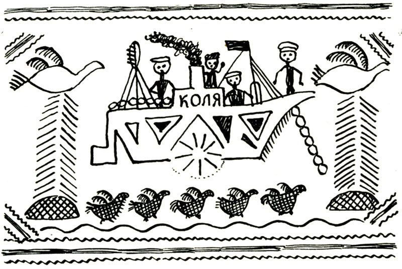 Изобразил он колесный пароход — из трубы дым валит, видна цепь якоря, а возле руля — другая цепь. На самом верху — капитан, пониже — три матроса.