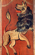 Уже при входе бросилось в глаза ярко расписанное цветами подпечье. А в самой горнице большая перегородка напоминала нехаевский дом в Еремеевской, с его конем и наездницей. Те же красно-бордовые доски, те же сине-красные с белой «оживкой» цветы в букетах и — о радость! — на крайней, самой широкой доске у русской печи — большой желтый лев. Первое, что подумалось: как он похож на того, что изображен в альбоме Бобринского: тот же изгиб ног, та же грива, тот же хвост. Затем другие сравнения. Вспомнились львы городецкой резьбы и, наконец, пришли на память львы, украшающие наружные стены Дмитровского собора во Владимире и церкви Покрова на Нерли, буквицы в старинных рукописных русских книгах.