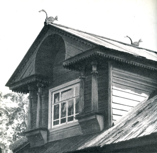 Городецкая барочная резьба, украшавшая речные суда, а затем домовая изумительны — другого слова не найдешь, чтобы оценить по заслугам это торжество вольной и могучей фантазии, смелости композиции, уверенности в обращении с топором, стамеской, долотом. И сейчас еще стоят волшебной красоты избы с резными украшениями в Шарыпове, Курцеве, Дырино, Ягодно-Лесном и многих других селах и деревнях. Глядят на вас с подзоров и наличников вырезанные порой безвестными, но талантливыми народными художниками берегини-русалки, или, как их еще зовут, «фараонки», охотники за львами (которых никто из мастеров и в глаза не видел, но делал, повинуясь обычаю), волшебная птица счастья — Сирин, с девичьей головой, нарядное, праздничное переплетение кудрявых трав и пышных цветов. Какая могучая композиция, какая смелость в ракурсах, в повороте туловища, головы, ног, а главное, какая убежденность в том, что вокруг человека все должно быть красиво! [Об этой резьбе хорошо писали М. П. Званцев («Домовая резьба», М., изд. Всесоюзной Академии архитектуры, 1935) и И. В. Маковецкий (Архитектура русского народного жилища», М., Изд-во Академии наук СССР, 1962).