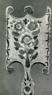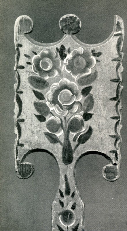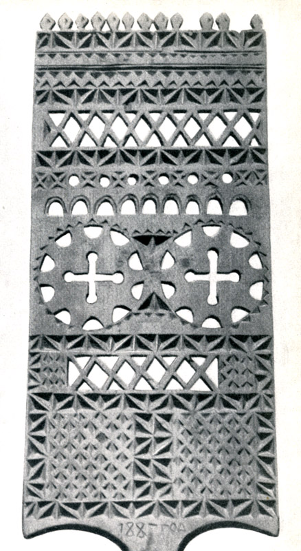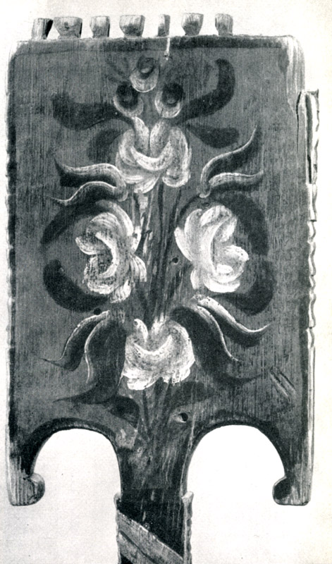 Прялки, которые, конечно, тоже издавна ладили мужья и отцы для своих жен и дочерей, украшали резьбой: сочетание кругов, треугольников, скобок.