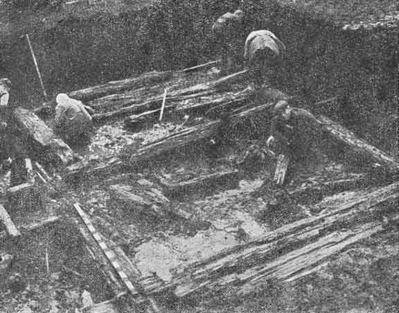 С глубины в среднем около 1,2 метра (где выше, а где ниже) количество керамики заметно уменьшалось. В изобилии пошли щепа, перегнившие остатки дерева, листьев и коры. Местами прослойка достигала 0,5 метра Обилие остатков дерева заставляло предположить, что вблизи находятся остатки построек или каких-либо сооружений древнейшего времени, но во время раскопок 1955 года они не были обнаружены, хотя в слое остатков дерева находили обломки стеклянных браслетов; всего их было найдено в этом году 5 штук, в отличие от 1948 года, когда нашли только один экземпляр.