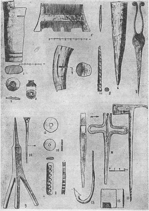 Puс. 4. Вещи, найденные в раскопе № 4: 1 — кость с надрезами, 2 — костяная пуговица; 3 — костяной предмет, 4 — кость с надрезами; 5 — костяной гребень, 6 — железный вток, 7, 9, 14 — железные светцы; 8 — костяная палочка; 10 — костяное шило, 11 — костяная пластинка; 12 — каменный диск (напрясло?); 13 — железный удильный крючок, 15 — заготовка костяного гребешка; 16 — костяная пуговица; 17 — железный молоток.
