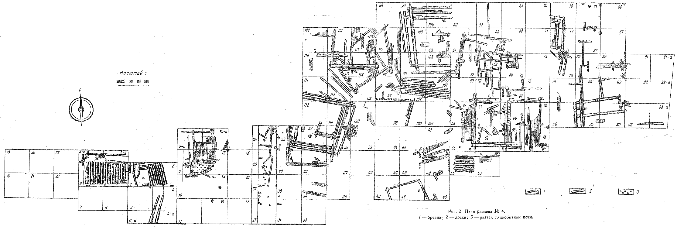 Рассматривая остатки деревянных построек, открытых в 1957 году, следует обратить внимание на некоторые особенности «планировки»: среди отдельных бревен, остатков срубов и частоколов можно заметить, во-первых, различную ориентировку остатков срубов — одни из них расположены почти в северо-восточном направлении (как, например, сруб на кв. 114—115, 118—119), другие срубы ориентированы на юг-север. При этом здания, расположенные в северо-восточном направлении, относятся к более раннему времени, доказательством чего могут служить только стратиграфические данные. Культурный слой между постройками незначителен, а в большинстве случаев отсутствует. Вещевой материал одинаков. По крайней мере, стеклянные браслеты встречаются в районе залегания жилищ как с одной, так и с другой ориентацией. Это позволяет думать, что хронологический разрыв между перепланировкой здесь был небольшим. Термин «перепланировка» можно употребить с большей долей вероятности, так как трудно предположить, что застройка сравнительно большой территории произошла по желанию отдельных лиц. Все это заставляет предполагать какую-то единую цель в перестройке. Пока что рано говорить о точной дате застройки, об архитектурном центре, характере и назначении перепланировки — для суждения обо всем этом у нас нет достаточного материала. Но следует напомнить, что раскапываемый район лежал в 300—500 метрах от Ленивой площадки, о которой упоминает автор «Жития св. Герасима». Несомненно, что эта часть древней Вологды была гуще заселена уже в силу своего сравнительно выгодно