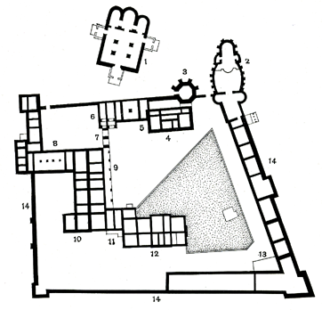 1 – Софийский собор; 2 – Воскресенский собор; 3 – колокольня; 4 – Казенный приказ; 5 – Безымянный корпус; 6 – надвратная церковь Воздвижения; 7 – переход на галерею Крестовой палаты; 8 – Консисторский корпус; 9 – Крестовая палата с церковью Рождества Христова; 10 – Иринеевский корпус; 11 – Гаврииловский корпус; 12 – Иосифовский корпус; 13 – служебные корпуса; 14 – стены и башни Архиерейского дома