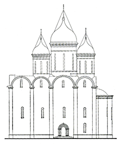 Даже среди богатырски мощных соборов XVI века вологодский храм выделяется монументальностью своих форм, почти лишенных декора (илл. 2). План его имеет вид прямоугольника с сильно выступающими полукружиями алтарных апсид. Цоколь очень простой формы образован валиком и двумя уступами в его нижней части. Между апсидами алтаря и с обеих его сторон поставлены полуколонки с простейшими завершениями. Расположенные в два яруса окна четверика сделаны с воронками, без всяких профилировок; нижние окна – высокие, верхние – небольшие. Все окна – четверика и алтаря – узкие, почти одинаковой ширины. С севера и юга в собор ведут ничем не прикрытые перспективные порталы. У западного, главного входа перед порталом стоит большое сводчатое двухарочное крыльцо с белокаменной гирькой. Вытянутые пилястры с заменяющими капители импостами поддерживают большие закомарные обрамления. Покрытие шестистолпного Софийского собора может служить классическим примером русской крестовокупольной системы. Над закомарами возвышаются мощные барабаны с огромными маковицами. Аркатуры отсутствуют не только на соборных стенах, нет их и на барабанах глав. Маковицы завершаются тонко выполненными крестами оригинальной, так называемой «процветшей» формы.
