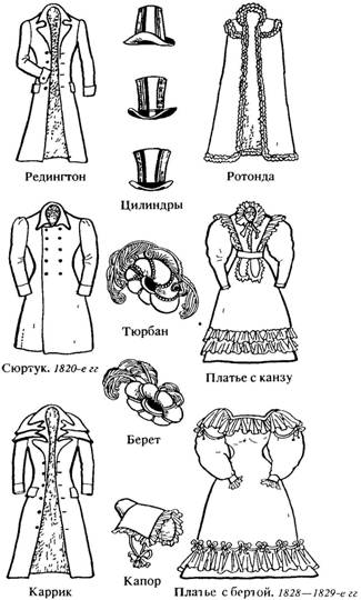 Зимой носили шубы, короткие шубки, теплые салопы, пелерины, рединготы, в теплые месяцы — бурнусы, дульетки, манто, мантильи на подкладке, летом на улицу надевали кисейные и фуляровые рединготы, легкие мантильи, тальмы, шали и шарфы. На улицу выходили также в бархатных, суконных или шелковых спенсерах поверх платья. Спенсер носили и дома в качестве лифа дневного платья с цветной или белой юбкой. При визитах шляпу, шаль или мантилью не снимали, как и перчатки. Ненадолго можно было остаться и в рединготе. Вошедший в моду