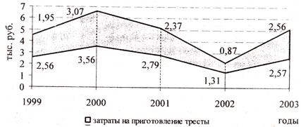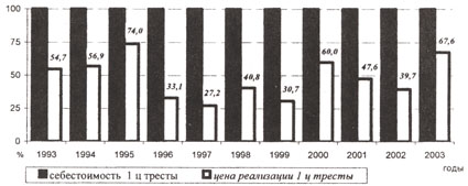 За период 1993–2003 гг. темпы роста производственной себестоимости опережали темпы роста выручки от реализации сельхозтоваропроизводителями льнотресты в Вологодской области в 1,5 раза. Себестоимость реализованной льнотресты не возмещается ценой ее реализации (рис. 2.2).