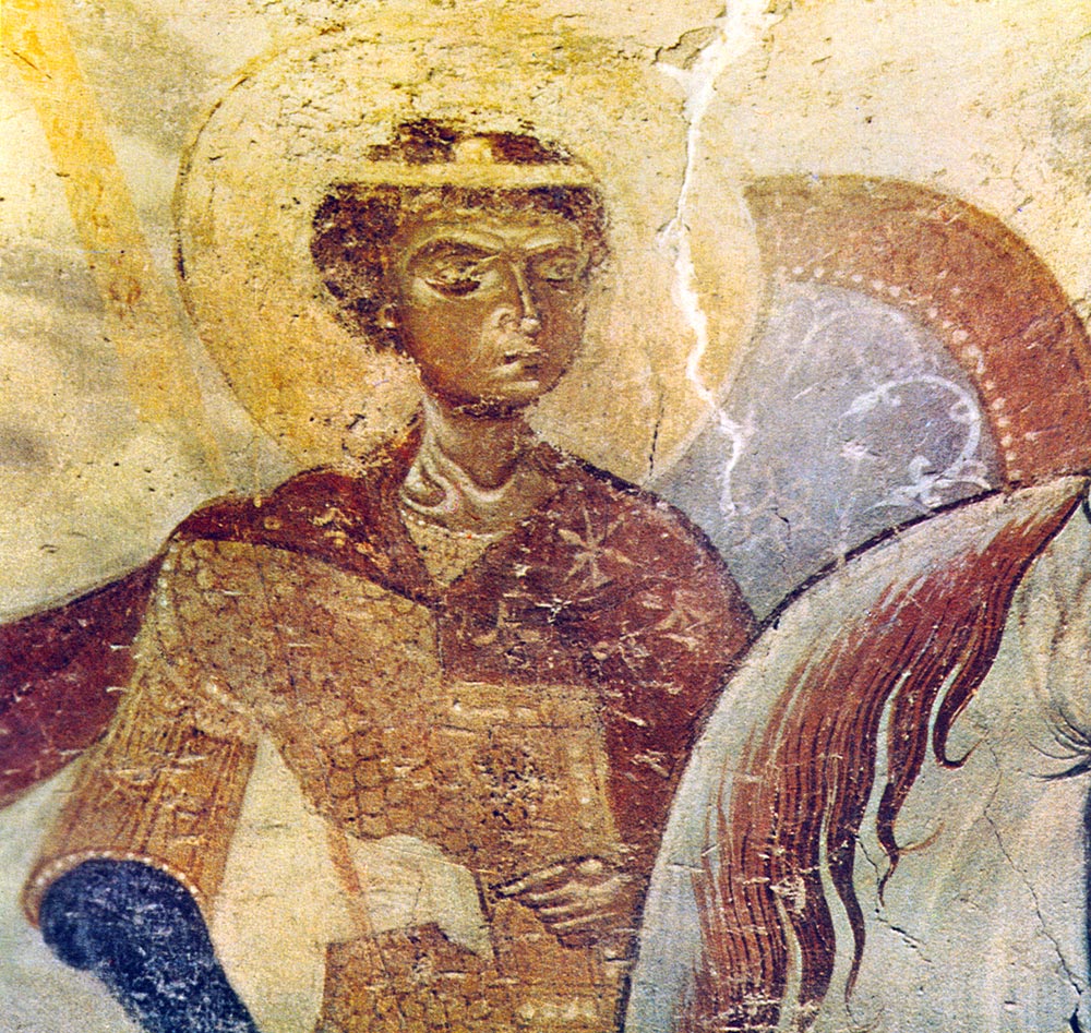 Старая Ладога. Церковь Георгия. Изображение св. Георгия. Деталь фрески «Чудо Георгия о змие». 1180-е гг.